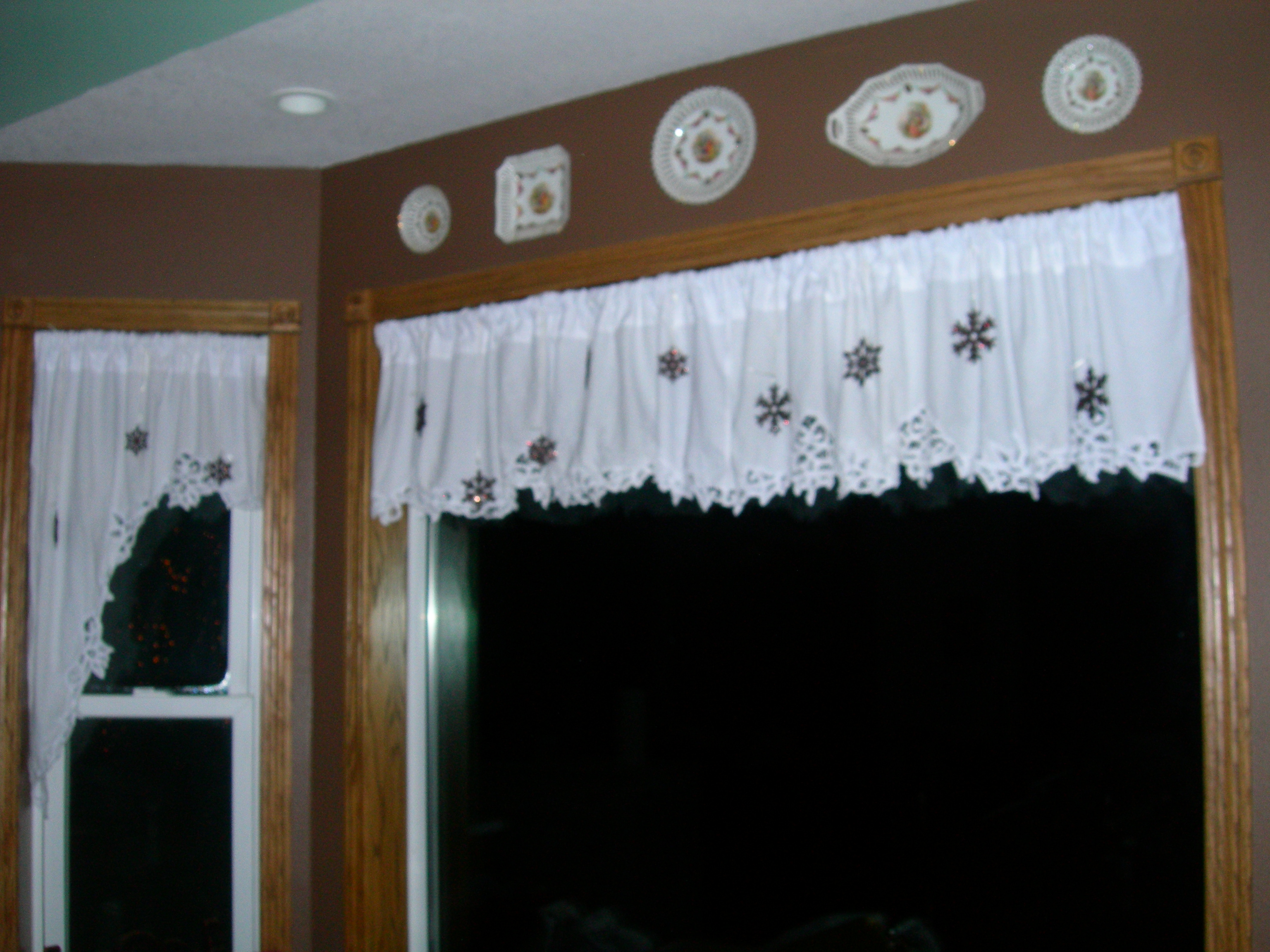 they are hard to see but the snowflakes are glittered and hanging from the rod. they are a chocolatey-red color and delightful against the white in soft light.