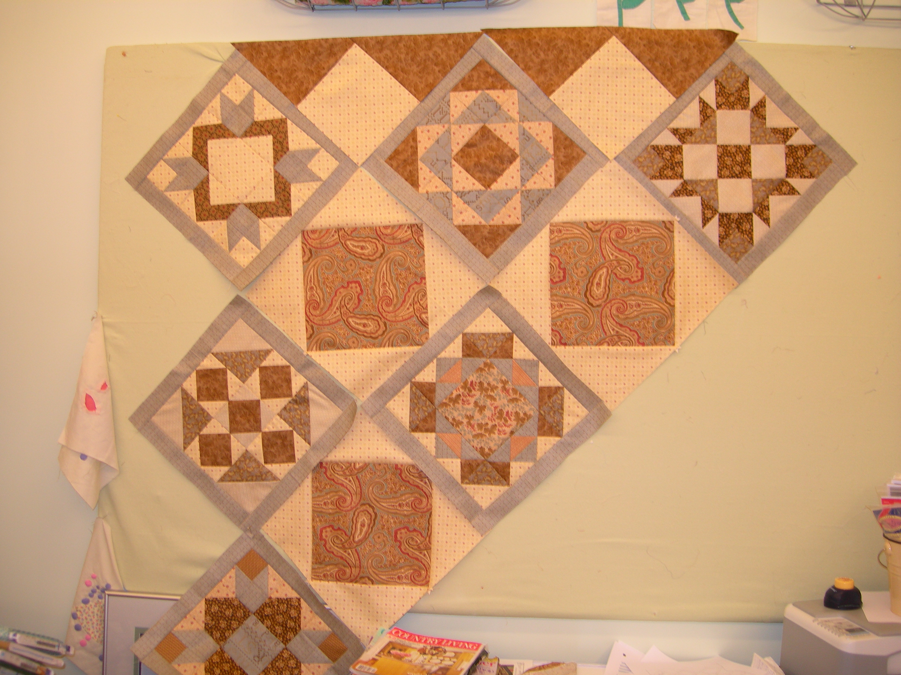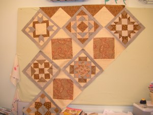 mom put together more of our block of the month…Blueberry Fudge…the picture below. it does not do this quilt justice. the colors are not really blueberry and fudge…more like cream, grey-blue and dark toast. i strongly suggest stopping in and taking a look if you are slightly interested in joining. (we need a final count so we can get in extra fabrics for settings, borders, etc.
