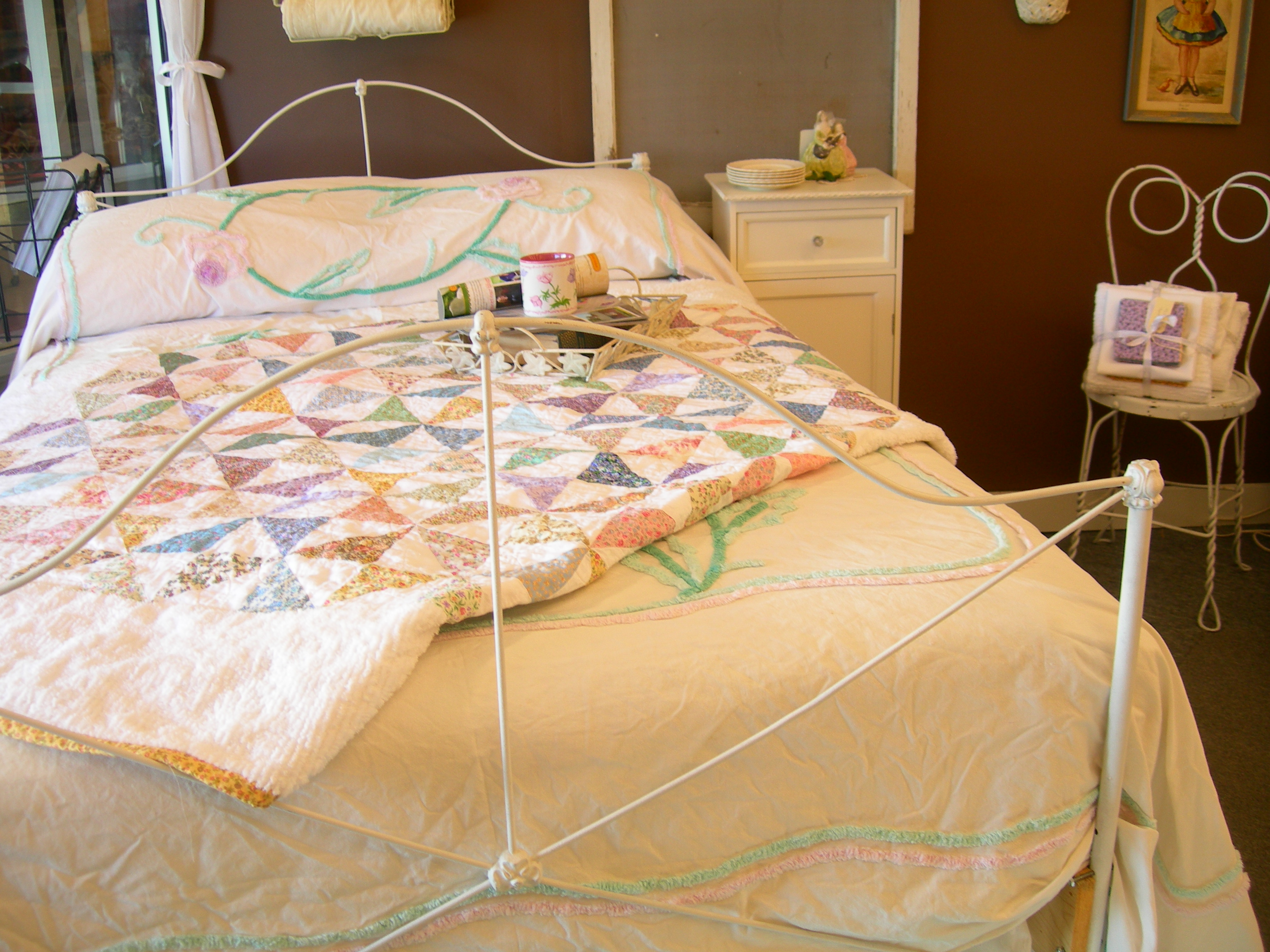 Chintz–a simple yet super sweet throw mom put together this week. it uses a charm pack of chintz-ish floral prints with a few paisleys thrown in the mix. the outer border is chenille and it has fun wide–really wide binding on it. It would be much fun to curl up with this spring. Kits are $101 and include: binding, chenille, and pattern. Chintz measures 68 x 76 inches.