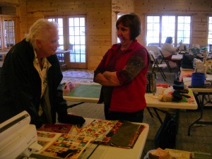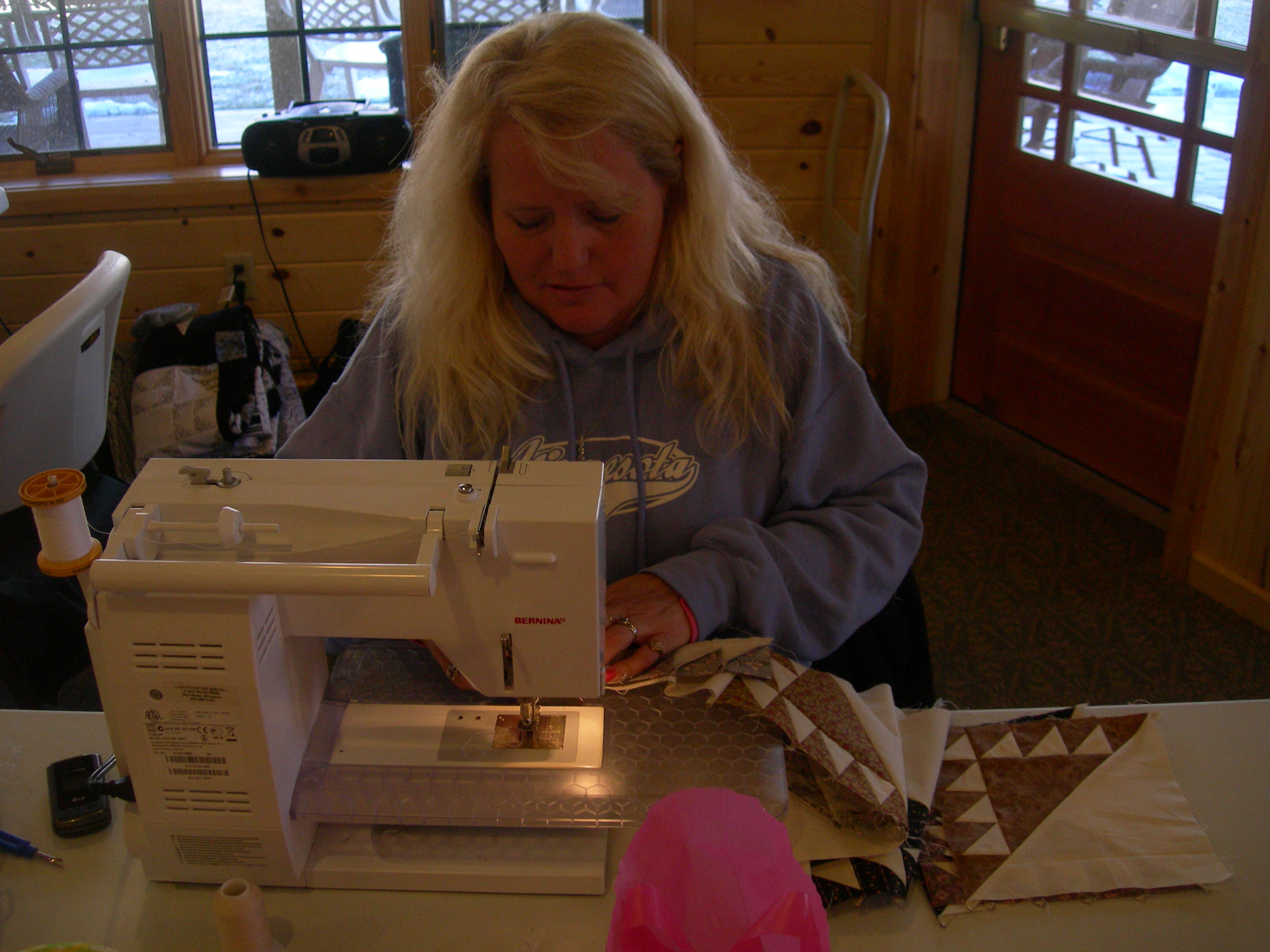 Ann sewing together strips (the bear paw quilt in the background was pieced by Shirley…absolutely gorgeous!)