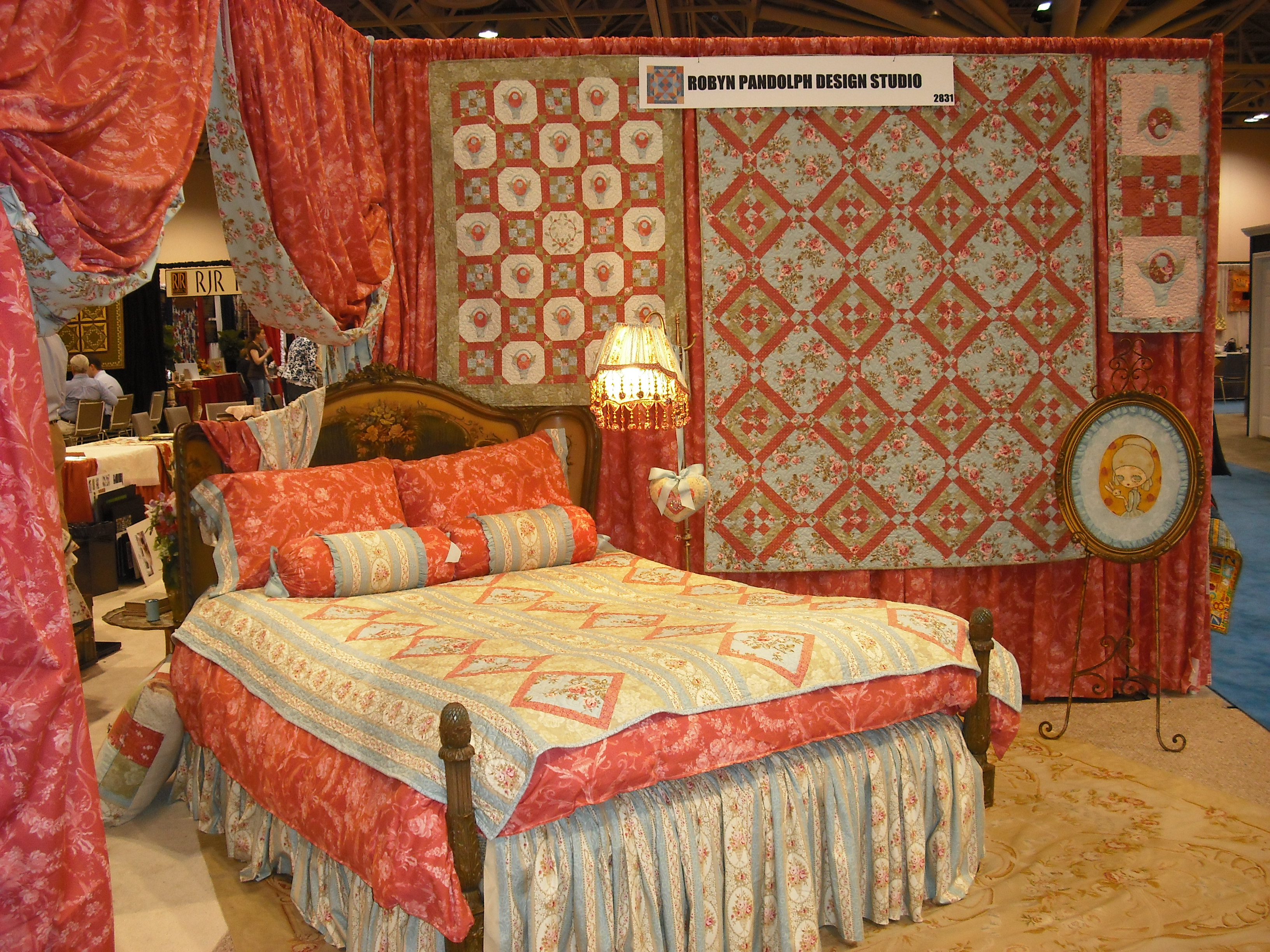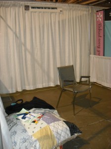 so ladies…we are home from market…all of us. mel tagged along today; she’s not big into fabric, sewing, quilting…(anything really that deals with fabric), but she did get to meet her heroine…but we’ll get to that later. first pictures of our booth from the very bare bones of it to the finished product…no award this time (4 years ago at our first market EVER our booth –which was in the end row…the last booth on the outside…we won be new exhibitor) i also took pictures of some of my favorite booths and also mom, mel, and i had our picture taken with some of our favorite fabric designers…we get to that…