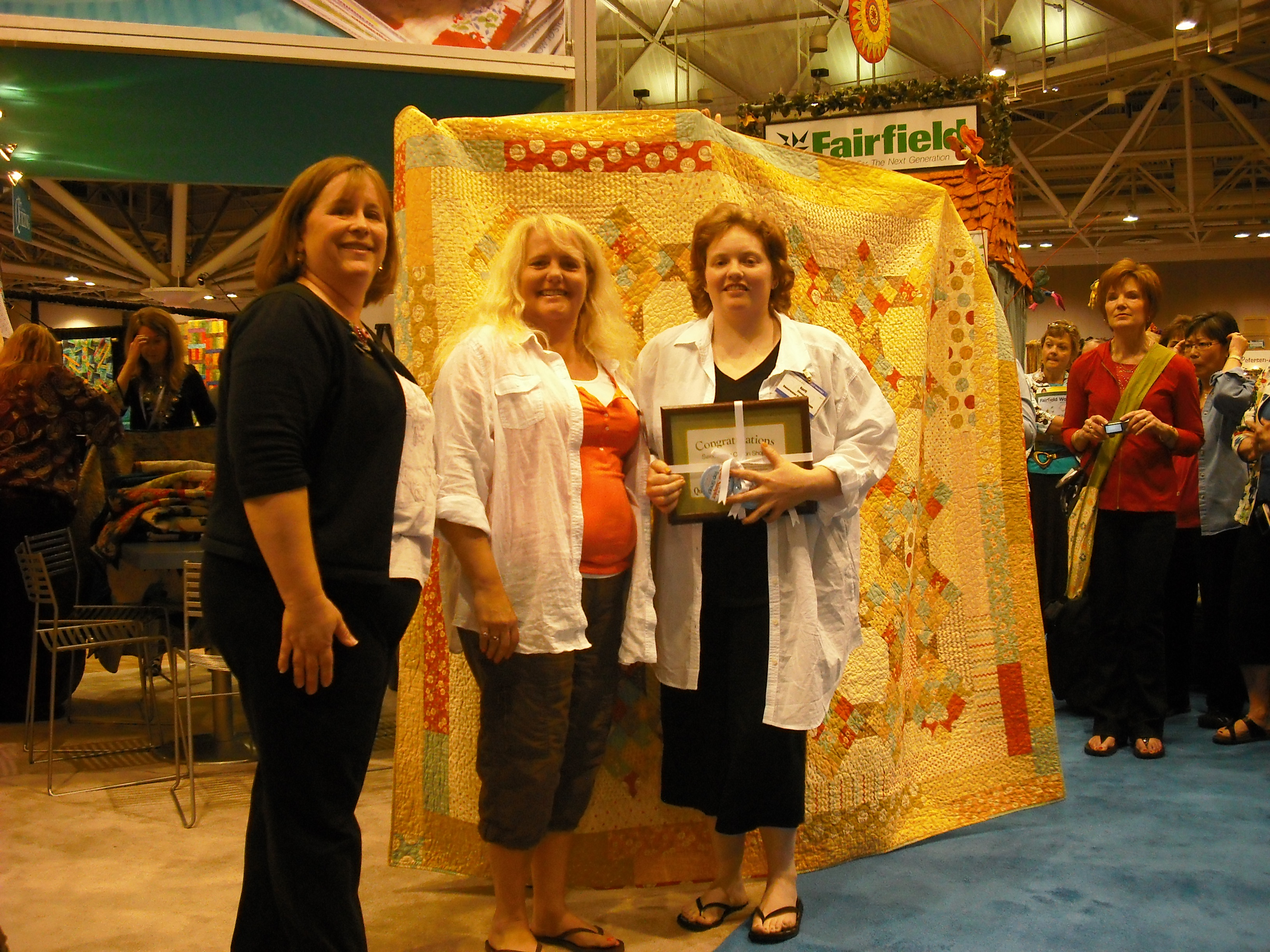 here is a picture of mom and i with Jennifer the Editor of Quilt Sampler magazine when we accepted our award.