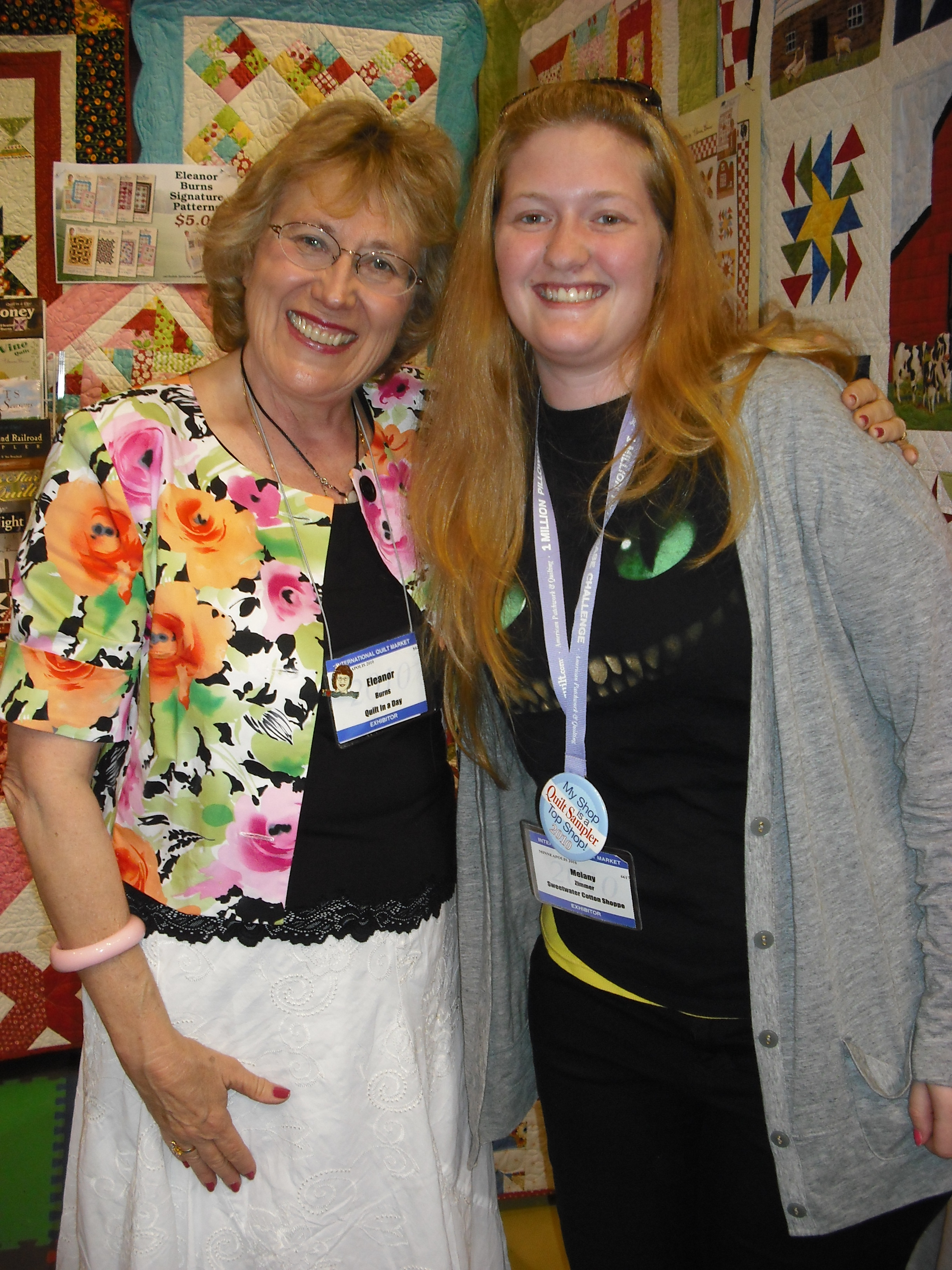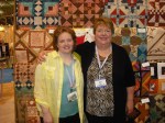 and lastly…mel got to meet her heroine, “the stripping lady” Eleanor Burns. Mel and i were walking down one of the many (18 or so) aisles and Mel asked me if “the stripping lady was here” i told her that Eleanor Burns the person behind Quilt in a Day would probably be somewhere and that we could look her up in the book. we took a few more steps and mel’s eyes got really big and she says quietly…there she is…so i took a picture of her with Eleanor. then (we had buttons that say “my shop is a top ten shop”) Eleanor asks me if our shop was in the current issue. it is. so she dug through a couple suitcases to find it and had ME sign her copy…it was so cool…i mean it’s Eleanor Burns…
