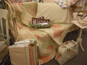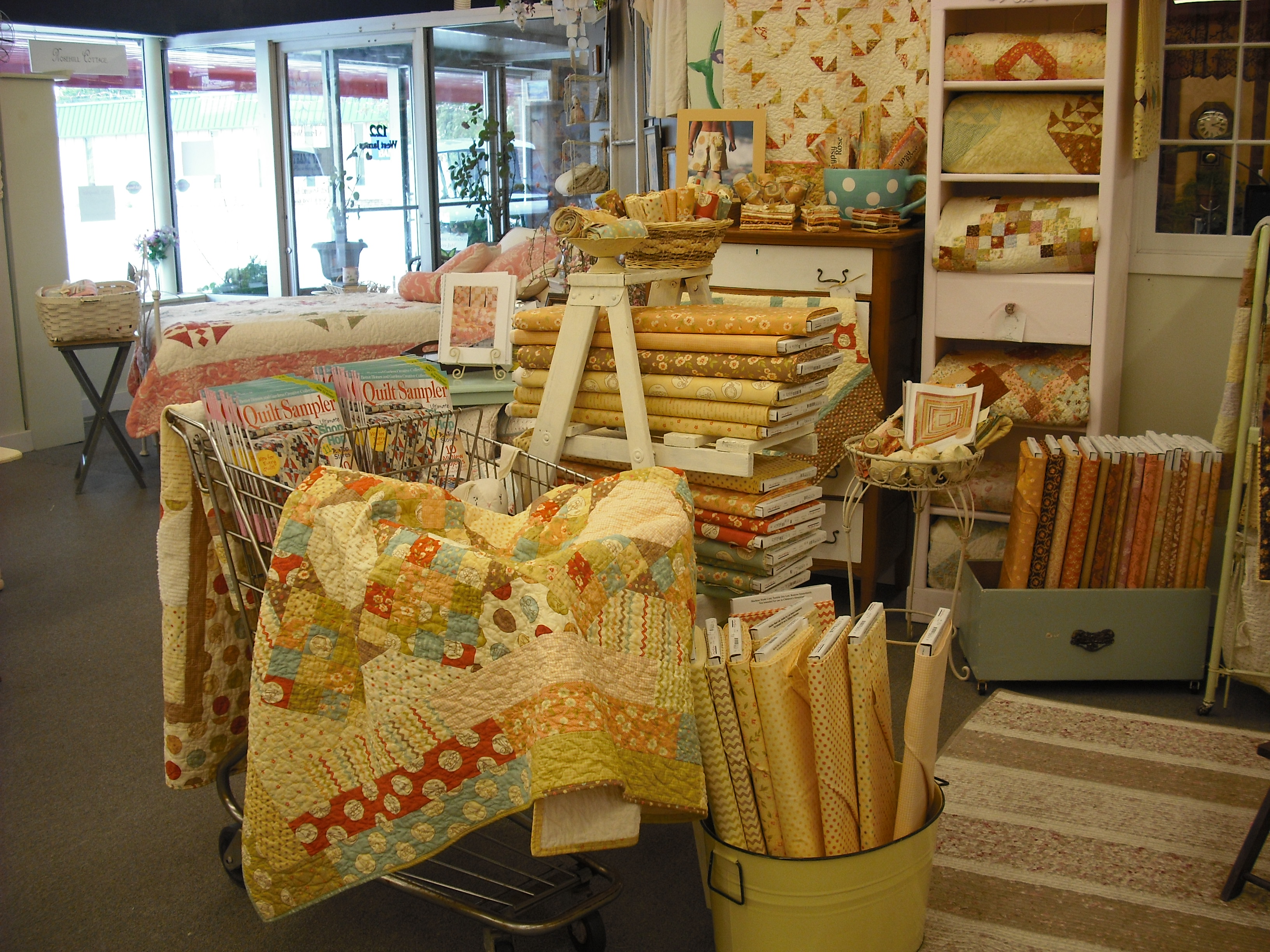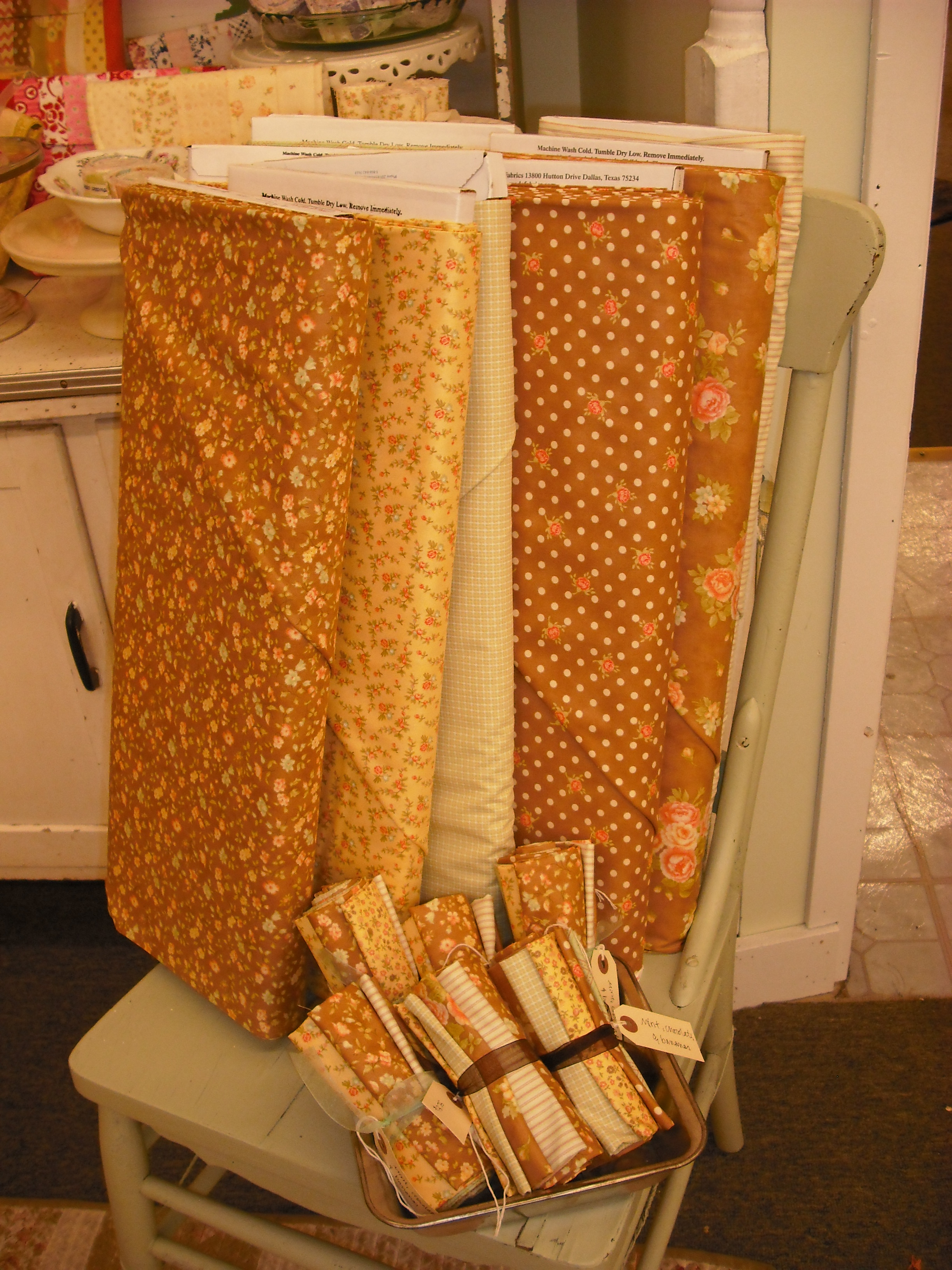 Lastly, we’ve got a new grouping that uses the new Fresh Cottons browns that came in and a few other prints. I call these Mint, Chocolate, and Bananas. The bundle uses fat 8th’s and is $13.75. the other picture is of our new fig tree display…i love the shopping cart…which i found at Weekend Cottage in Clear Lake.