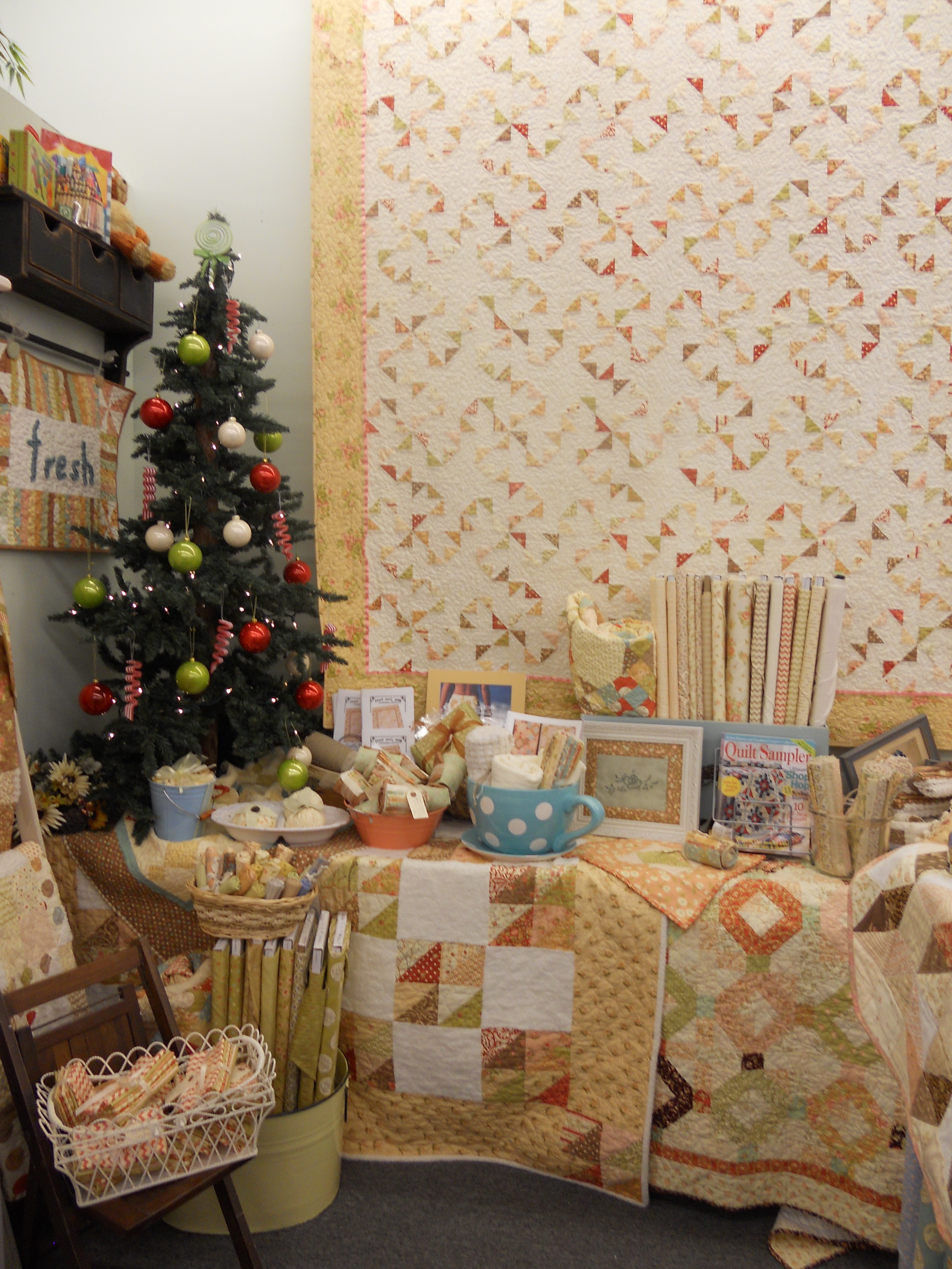 Fig Tree being one of our favorite designers…we always have one tree that is spruced up using her signature colors for the year…last year it was subtle with soft green, pears, and blush pink. this year…with a nod to our Happy Days quilt featured in the Spring Issue of Quilt Sampler, we’ve pulled the green, cream, and red from her spring Whimsy line…to give you our Sweet Tree…which is Truly Scrumptious…