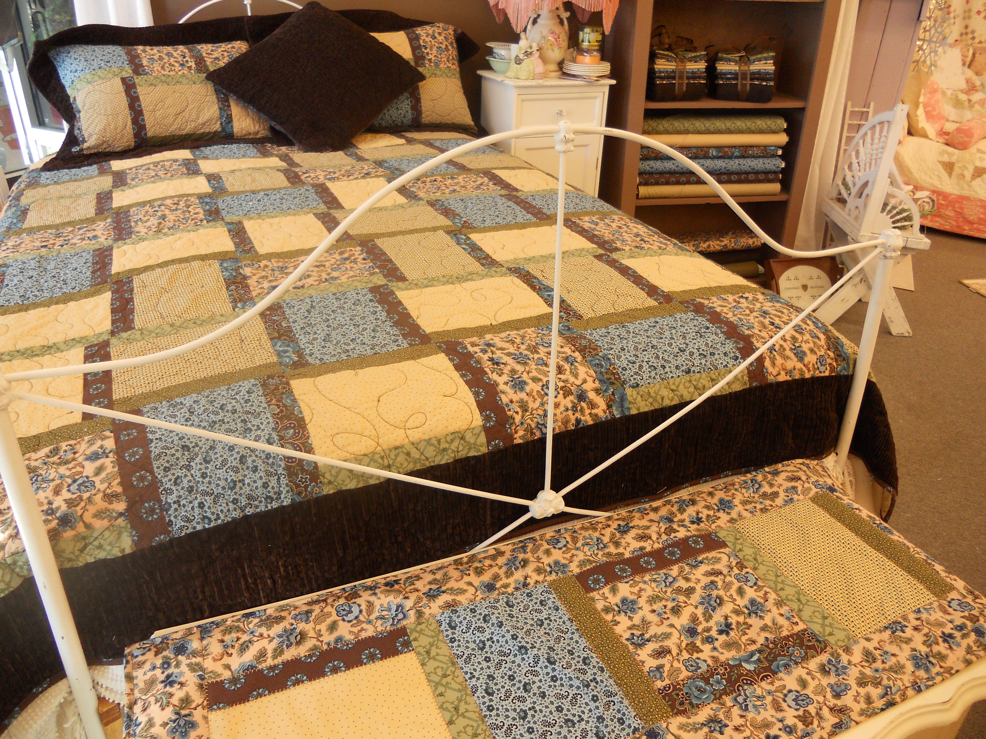 is our new pattern…a lovely mix of peacock-blue, sage, fudge, and toast make this bed-size quilt absolutely YUMMY…features a basket weave pattern with a striking fudge corduroy border, which is echoed in the pillow shams…then echo stitch a flower on the corduroy for a super scrumptious throw pillow…