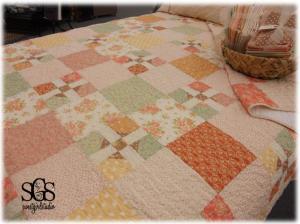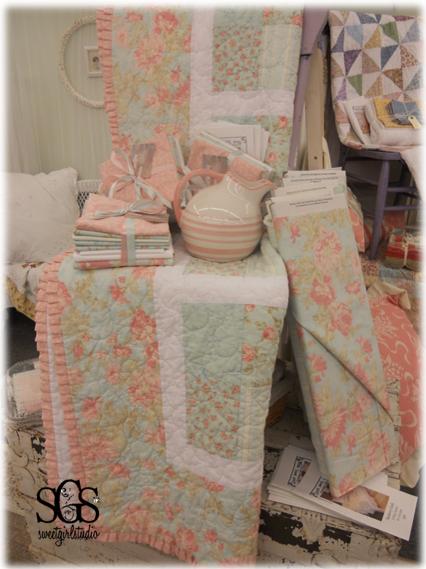 Then lastly…a dash of spring during the long, cold days of February…with a little bit of aqua beach house by Robyn Pandolph, pink from Anna Griffin’s Paige Stanley Miller’s Juliet, and a little bit of white…we’ve brought spring…6 weeks early {add in a fun little border ruffle} and it’s just delightful…perfect for that little girl’s or big girl’s room. Quilt finishes at 83 x 93 and the kit is $94 with the ruffle yardage included…pattern is separate for $