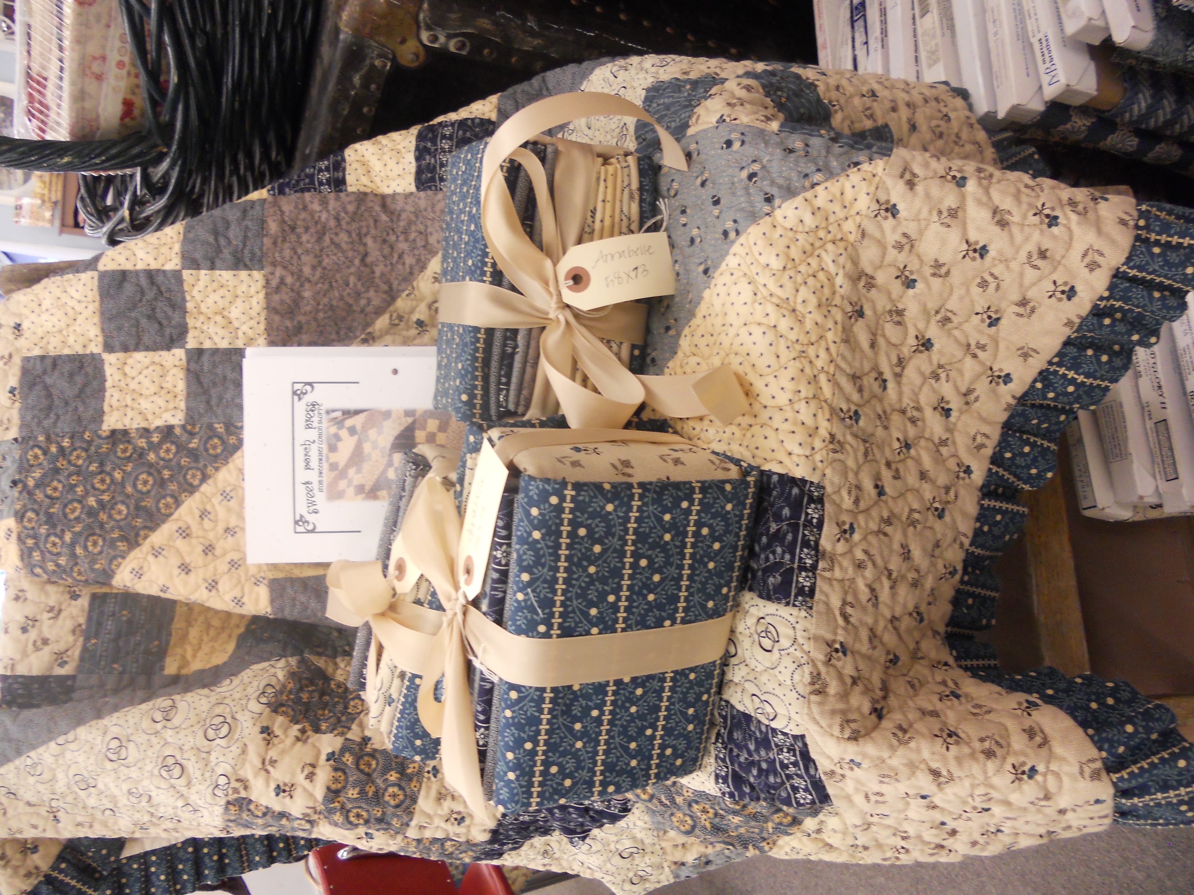 First up…sweet Annabelle. Made from a lovely mix of civil war creams and blues in a half square triangle and 9-patch setting then topped off with a ruffle. This quilt measures…52 x 67 inches (this includes the ruffle) and the kit is $57 and the pattern is $8.