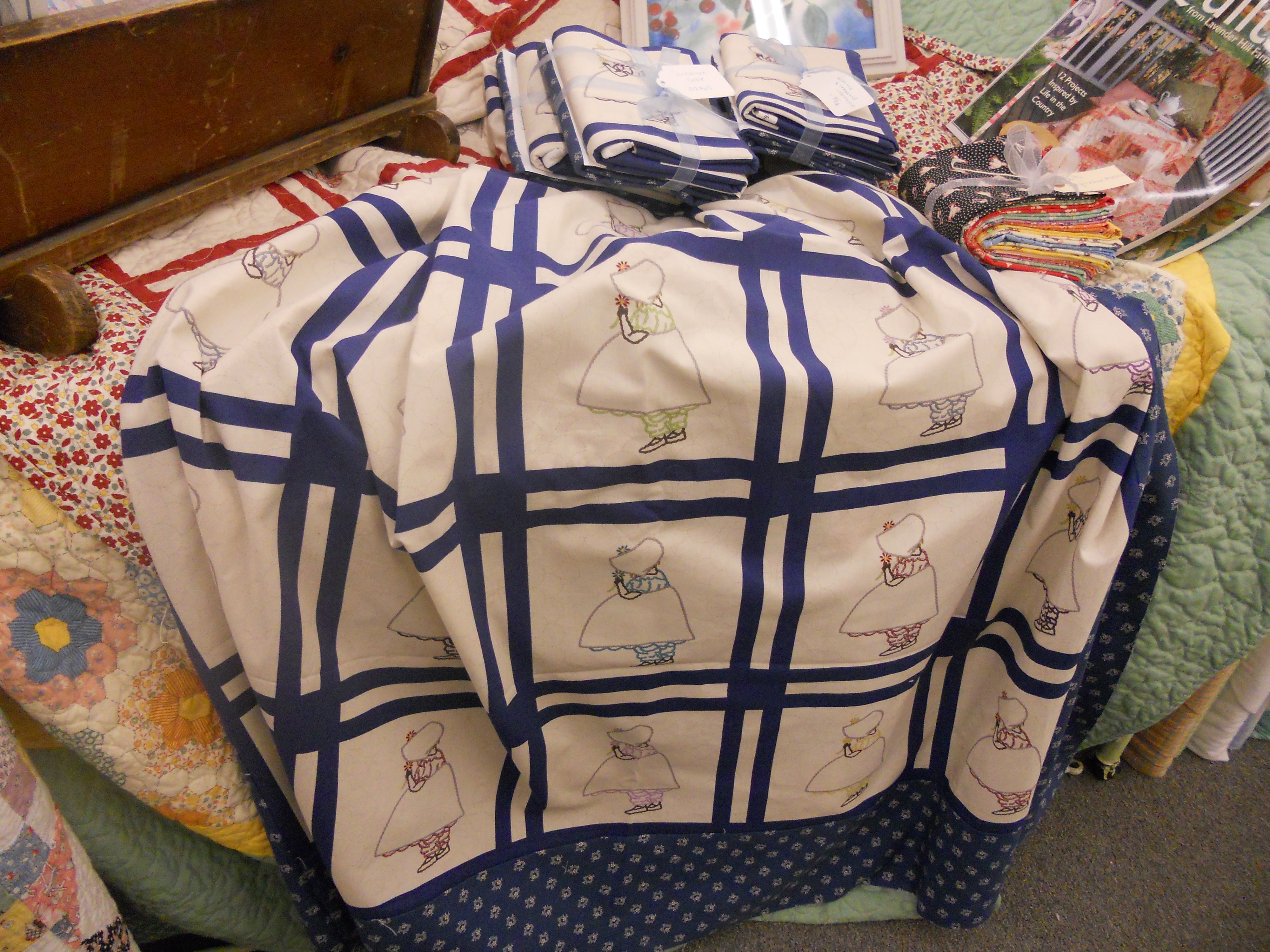 Lastly, the Sunbonnet Suzie in blue…Tina let me borrow her quilt so you all could see what it looks like finished up in the blue–she is going to hand quilt it when she gets around to it. Kits available!