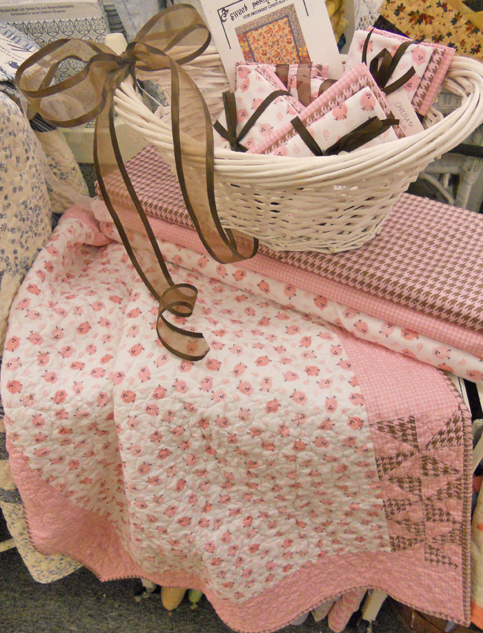 Mom also put together a Chocolate Owls version of Apple Butter. We skipped the narrow border and just did a pink, chocolate, and white baby girl’s quilt. A simple medallion set off with pinwheels in the border and a houndstooth pink and chocolate print. Quilt finishes at 30 x 40 inches. Pattern is $4 and the kit including binding is $20…we will be kitting it with the pink check the pinwheel and the pink and chocolate houndstooth print the border and binding.