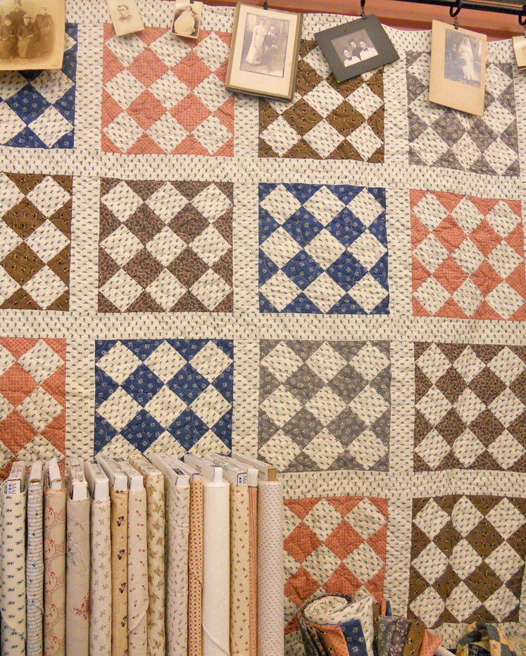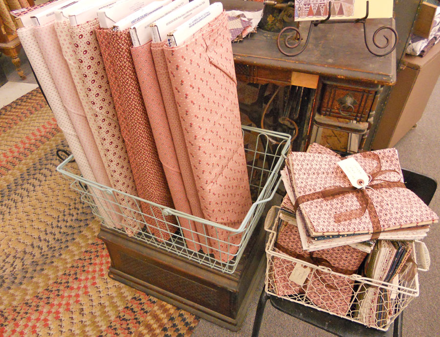 This next one is called Basically Kaye–it is a pattern designed to go with Kaye England’s fabric line Basically Kaye Shirtings…we’ve tweaked it a bit (in color options only) and paired this pattern with Julie Hendrickson’s Miniatures and a couple blues, a gray, a purple, and a green for a little bit of pop. We’ve got it kitted with binding (green) and the pattern for $67.50…it measures 48 x 60. Mom is still working on the sample, but here are the kits and some of the fabrics. I’ll post a picture when it has been completed…think simple stars and borders…or stop in and take a look.