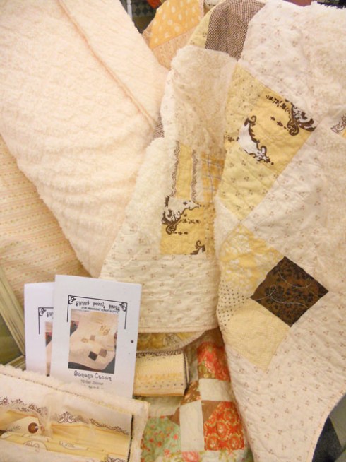 Next up is Banana Cream…a sweet little baby quilt that uses banana, cream, and chocolate. A variation of Fudge and Roses this uses a Soft and Fluffy in cream and backed with the yellow disc print from Whimsy. Quilt measures 35 x 46 inches.