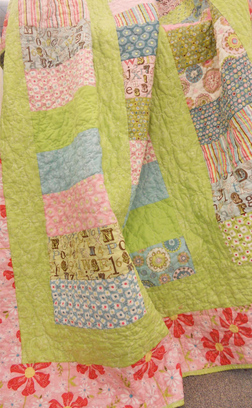 First up is Sugar Pop. A combined effort of Blake’s Sweet Divinity and Penny Lane fabric lines. The stacked rows are set off with a lime green and bordered with a luscious pink…backing is the Font print from Penny Lane. Quilt measures 56 x 74 inches.