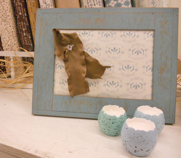 for my birthday this past April, Megan got me this lovely distressed frame…it matches this line perfectly–as do the little egg candles, so for a cottage look…check out the framed fabric below…i’ll be putting a tutorial on our sister blog… blissfully cottage sometime this weekend.