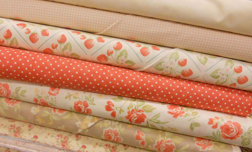 Wednesday we finally got our order for Strawberry Fields…just lovely, they are! Mom is currently working on a fun summer throw. then she’s going to put together a set of Tea and Bisuits throw pillows using the check and the grey. {right now though, all i have is a picture of the bolts}