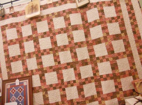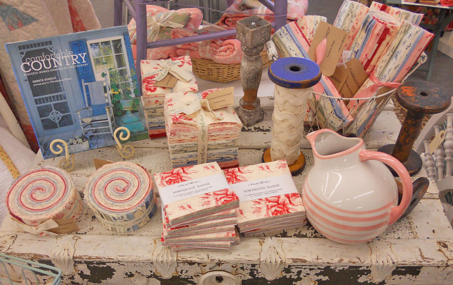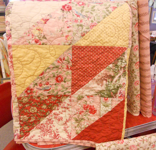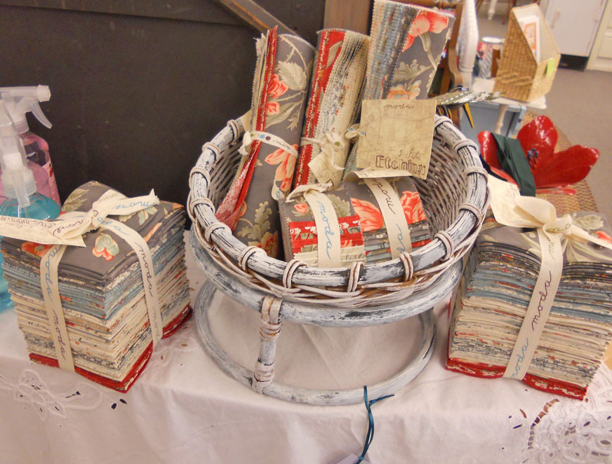 Etchings by 3 Sisters…fun precuts in romantic cream, bluebell, slate, and cherry red. Mom is currently working on romantic bed-sized quilt…
