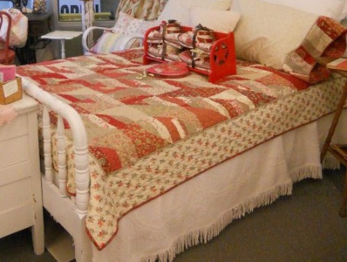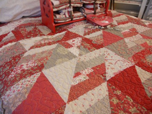 this blog post is in reference to the upcoming holiday…Valentine’s Day! An alright holiday…i don’t mind chocolate–but what i really love is mom’s new quilt He LOves me… just in time for the season of love. this quilt is made using Rouenneries Deux by French General and Etchings by 3 Sisters and a little bit of linen.