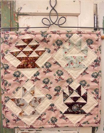 Anne Elizabeth…named after the sweet girl who moved into the house (it sounds like a reality show but even more boring) this past Thanksgiving. This little quilt is 11 3/4 x 11 3/4 inches and fits this cute little hanger perfectly. Made with lovely reproduction civil war florals and 4 different baskets…it is perfect spring decor. We have kits available on etsy here.
