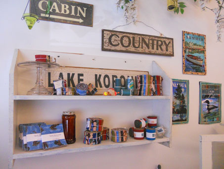 First up…a shot of the entire display. This is the best shot of the hammock i could get. The sunlight behind it is nice but doesn’t help the picture taking. The projects are from left to right…Backwoods Burlap Bag, Golden Pond, Cabin Cases, Easy as Pie, and Minnesota Moonlight. Please keep in mind that these are our unique designs and that the kits and book for these are limited and exclusive to Sweetwater Cotton Shoppe.