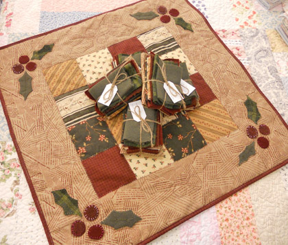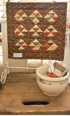 now…Milk & Cookies. we had some older christmas prints that we’ve been moving from here to there and then back again. mom put together this fantastic little topper (which is charm pack friendly) then added a little bit of wool applique using EdMar threads to stitch them down.