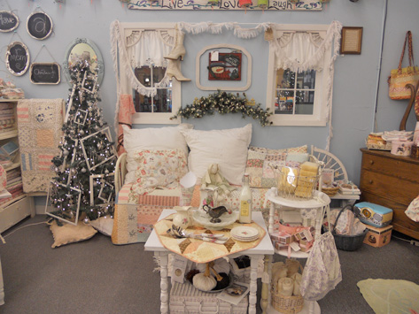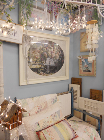 now if we go back to the doorway and take a right…you’d see our wonderful shabby cottage fabrics. this tree came about because i wanted more white to offset the silver…and with the frame shoppe, it seemed appropriate. (this one may honestly be my favorite!) First off…some snowflakes and a very sparkly birdhouse!