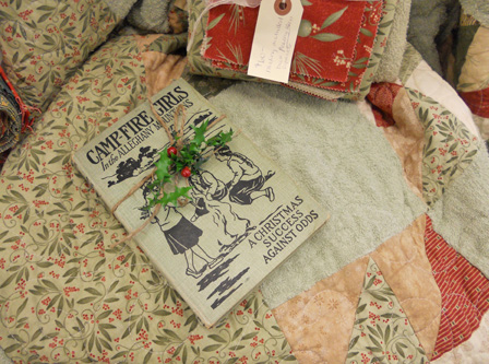 i LOVE this tree (and will probably say that about every tree)…but this one came as i unearthed the last Eskimo Kisses kit…then the Camp-Fire Girls book that Monica gave me…all the colors were perfect together. Then i was digging through the boxes of Christmas and came upon the sage and tan bulbs and knew they were all perfect matches. I hunted up a few other things…old, short, red spindles that i tied to the tree, some acorn ornaments from before we moved and fun birdhouses that became the topper.