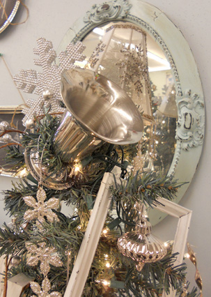 i really do love this tree topper…a hodge podge of lovely silver and grey. A large silver beaded snowflake, a vintage silver vase, and a fun grey dangly lampshade–and a close-up of a frame.