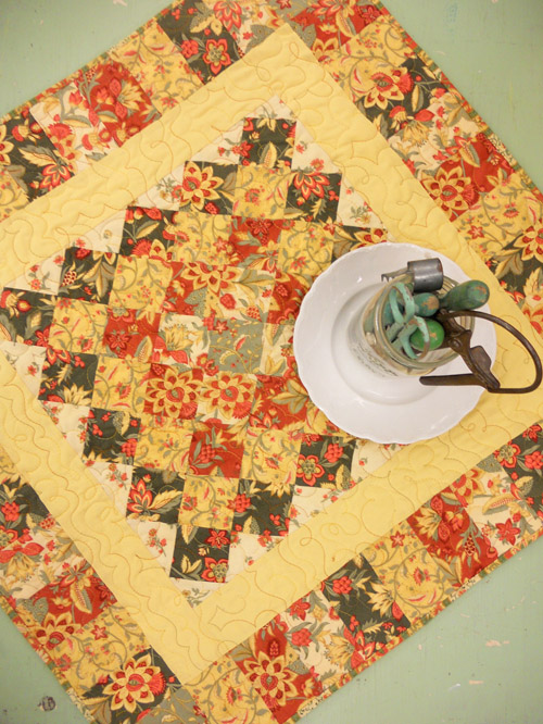 measuring in at 31 x 31 inches, this little jewel of a topper features a lovely tomato red, sunny yellow, sage, and cream. perfect for a sun porch or breakfast nook. the center is an around the world block bordered in sunny yellow. this topper is kitted and absolutely wonderful for the coming spring/summer season. set the table with a “bouquet” of green handled vintage kitchen ware and you are good to go! for a kit… for a pattern… for a PDF pattern…