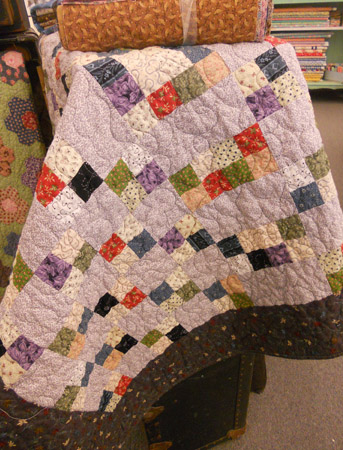 i do have pictures of the super pretty grape juice inspired Miss Molly quilt. this one is so pretty with its grape juice purple and scrappy 4-patches. that purple really brings it all together! Love it!