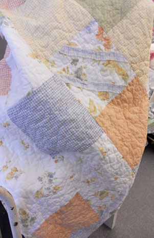 Ruffled Rose…is just so adorable. Lovely checks, dots, florals, and a scrunchy grey ruffle. Totally shabby, totally cottage-y, totally Sweetwater. Ruffled Rose will be available in the next couple days. –also, notice how we staggered all the seams, no need to worry about matching up corners. Perfect for the beginner, intermediate, or advanced!