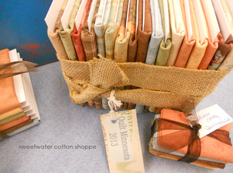 we, of course, changed it up a little bit. i attached a little info to the “Sweet Petites: One Yard Wonders” and the “Sweet Petites: Fairy Fats” are all bundled and tied up pretty with a fun little tag. (Our Sweet Petites will make their premier at the Quilt Show in Bemidji in Late July.) we will also compile a grouping of patterns that call for one yards.