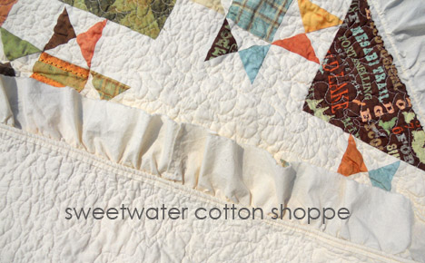 picture 2: Rufflestillskin…uses 2 panels of the 5 inch squares, border backing, and ruffle–no BATTING…so this quilt is the perfect summertime throw.