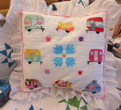 we have taken all these wonderfully, whimsical campers and make up our own little “park”. First off, we pieced them with “Glamping” by MaryJane Butters and other coordinating fabrics. Then we pieced them into a pillow with a piping strip and a ruffle. Then we embellished each little camper! it was so much fun; we will offer an embellishment packet with our finishing kit for our Sweetwater Glamper Park. our little teardrop camper has party lights!