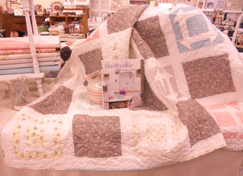 She is absolutely lovely and modern and the colors of wildflowers and daisies with a little bit of grey. She measures approximately 60 x 60 inches, so the perfect throw size for your summer porch, hammock, or picnic. The grey is wonderful mixed with the white sashing…and the variety of prints including houndstooth, florals, tonals, and geometrics are perfect backgrounds for white churn dashes. This project uses fat 8ths and features a scrappy binding.