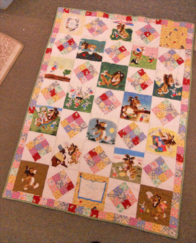 Childhood Favorite features the Little Golden Book Tawny, Scrawny Lion. this baby quilt is perfect for the new little baby in your life. it features a Little Golden book panel along with super-sweet 30’s reproductions. it finishes up just cute as a button. it is perfect for a crib at about 40 x 56 inches.