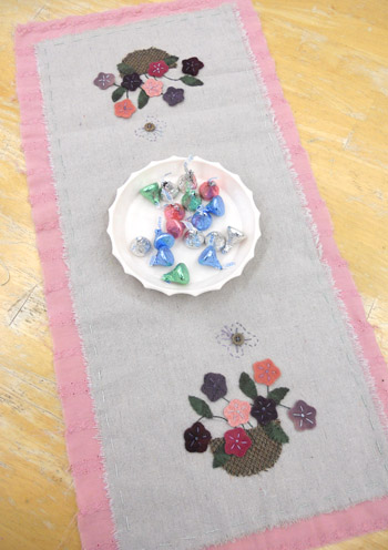 this little gem…Summer Basket which is more like a bowl uses our most favorite shade of grey painters’ cloth, a lovely overstitched pink, and wool in a mix of both spring and summer flower shades. i love it on the natural wood table…with the pink milkglass dish of kisses.