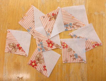 Place the 3 1/4 inch dark and light squares face to face. Draw a line diagonally and sew a 1/4 inch seam down each side. Cut along drawn line. Press and trim.