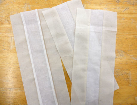 Now cross-cut sashing strips to length of blocks. Ours were cut at 12 1/4 inches. Cut a total of 31 combinations.