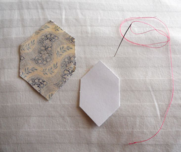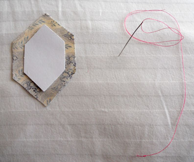 Cut the fabric a 1/4 inch larger than the paper. Then thread a needle with “junk” thread. I use the cheapest, brightest thread I can find, since this is for basting and will be pulled out.