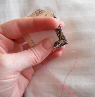Start by folding 1 corner and running the needle from the front to the back so the knot is on the front. (I put the needle through the paper, so it is secured and I have a sharper corner.)