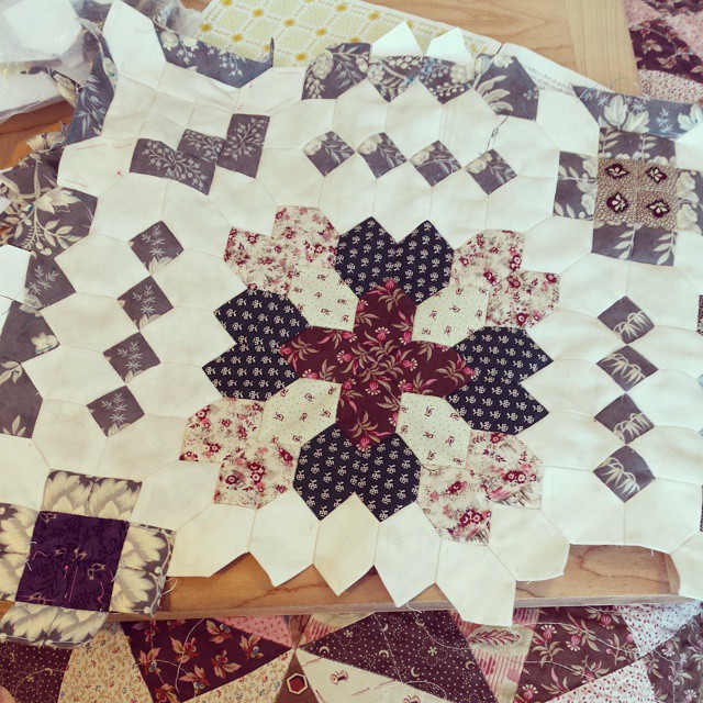 I have worked ahead…I (think) I have everything cut along with all the 4-patches and flowers stitched together with cream honeycombs around 29 of the flowers. I have even started putting the first row together. the goal is to have it finished by Mid-March…hopefully…I will still be posting a block a week here on the blog.