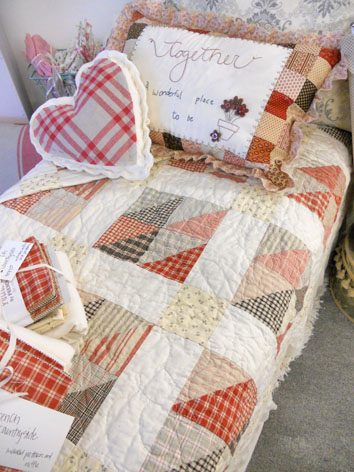 also…I LOVE that it is red and pink. wonderful for Valentine’s Day…mix it with the Countryside Quilt you have been piecing. Do you love French General…this blends with all of their fabrics. Below we have it with Countryside and some heart pillows we made using batting and linen…