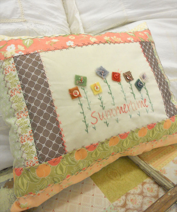 Together (a pillow) is classic Romantic Prairie style and the perfect size at 16 x 23 inches. a moda candy of Petite Prints by French General, some embroidered unbleached muslin, wool, buttons, and a hand torn ruffle. The pillow says it all…