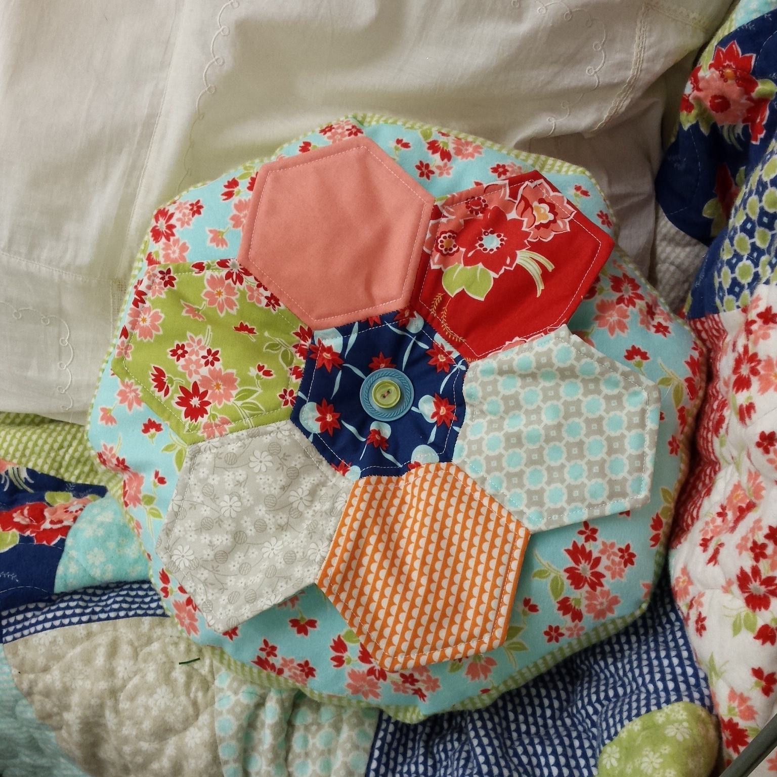 Our new Retro Hexie Bloom using Miss Kate flannel and a few honeycomb hexies. Kits are available in our etsy shoppe.