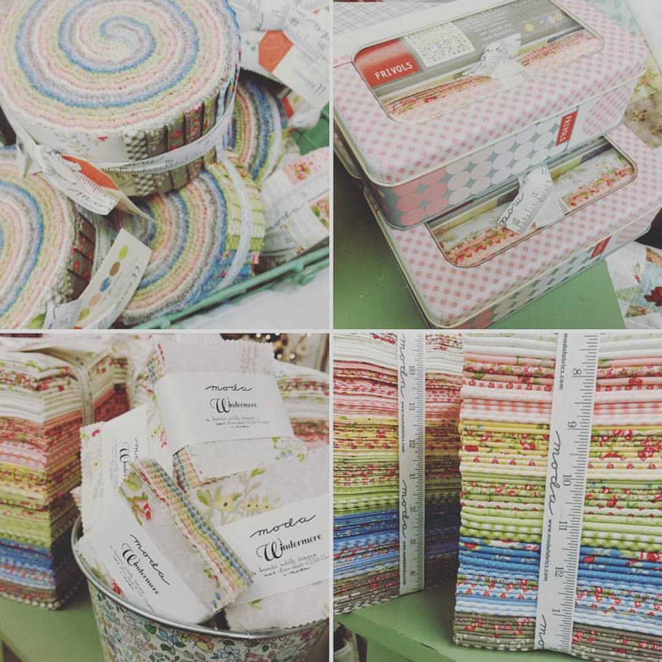 Last week our Windermere precuts arrived…bunches of jelly rolls, bundles, and mini charm packs to match Frivol #4 which arrived a week or so ago. I love this collage of Windermere loveliness! I have these listed in the online shoppe and in-store as well. Who wouldn’t love a bundle, roll, or Frivol tin tied with a bow and under the tree?