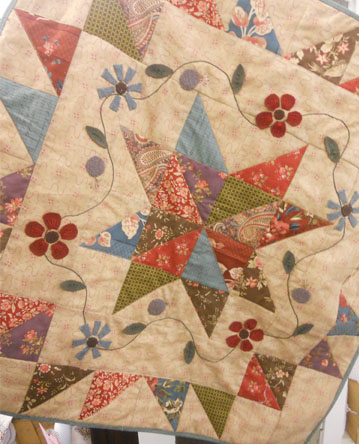 Primitive Hot Cocoa…I know…it is summer (almost), but the Hot Cocoa pattern calls out to us. This simple star surrounded by “perfect-for-embroidery” space. The original was made with shades of brown and brown embroidery on the deep aged cream background and was breathtaking…then we did a QM2015 version using a soft creamy background with brown and blue with no embroidery. This version is very traditional featuring a mottled-almost-gold background with dark aqua, red, purple, green, and brown accents. This little project features fabric from 4 different lines, embroidery, and wool appliqué.