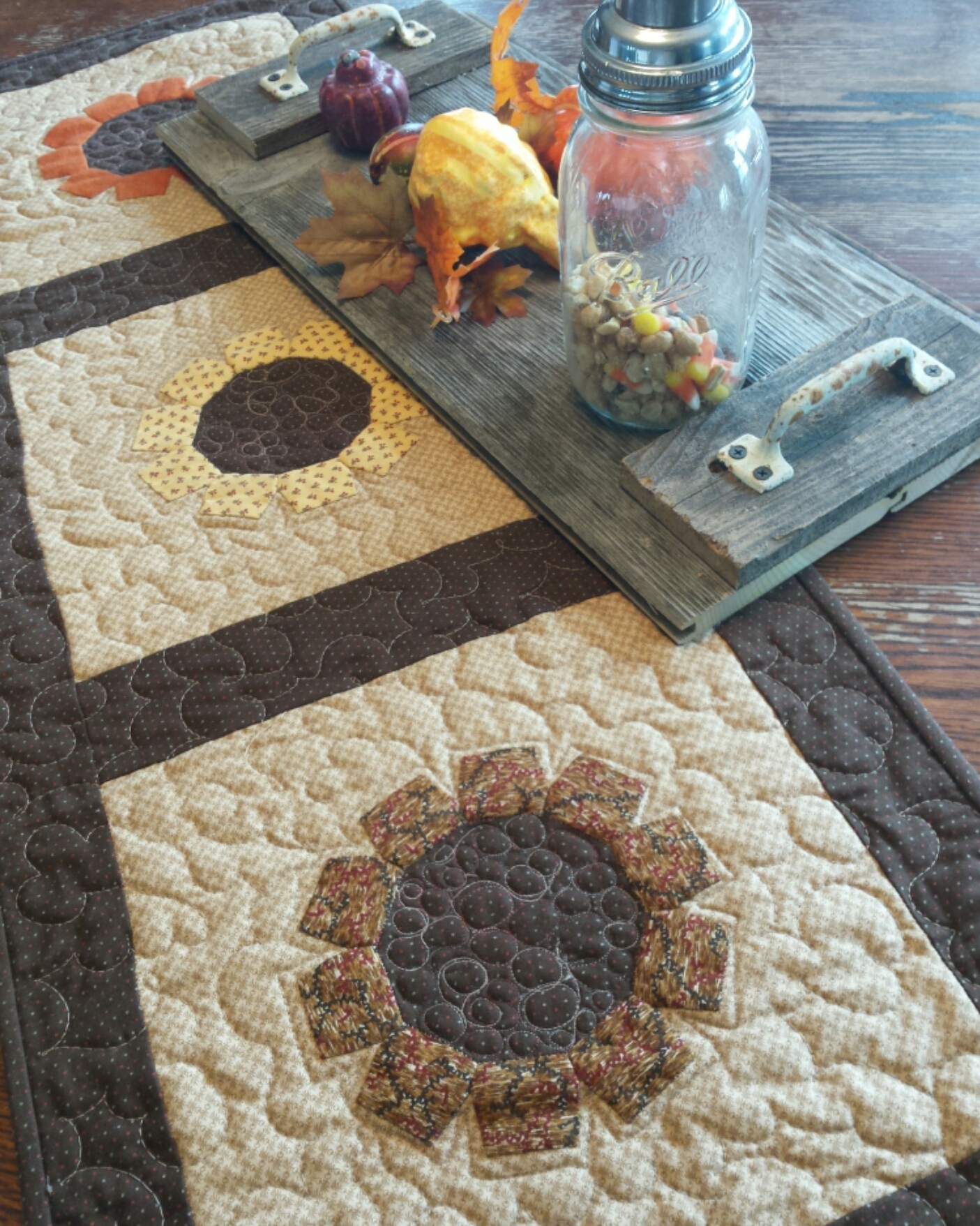 Sunflowers table runner…just finished up this lovely. It uses English paper piecing for the sunflowers. The shape is the short coffin…the center is a decagon. It is sure to please with a tray, goards, and treats.