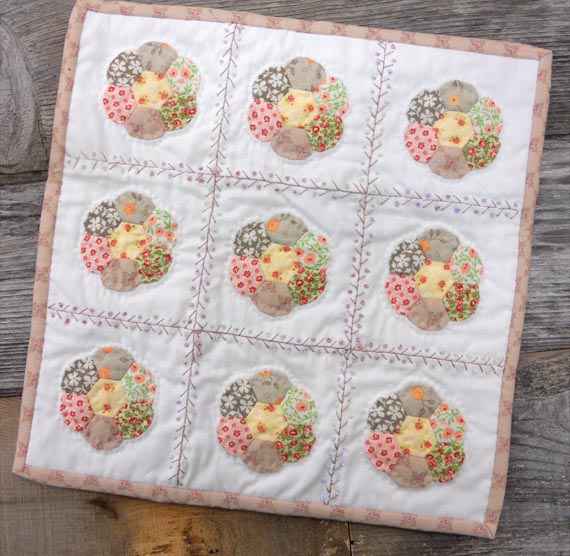 Parfait is adorable as well at just 10 ½ x 10 ½ inches. This Confection features Chrysanthemum papers which we’ve separated to look like fan blades. We chose brighter feedsack reproductions and added some yoyos and embroidery. (I LOVE that pop of brown!)