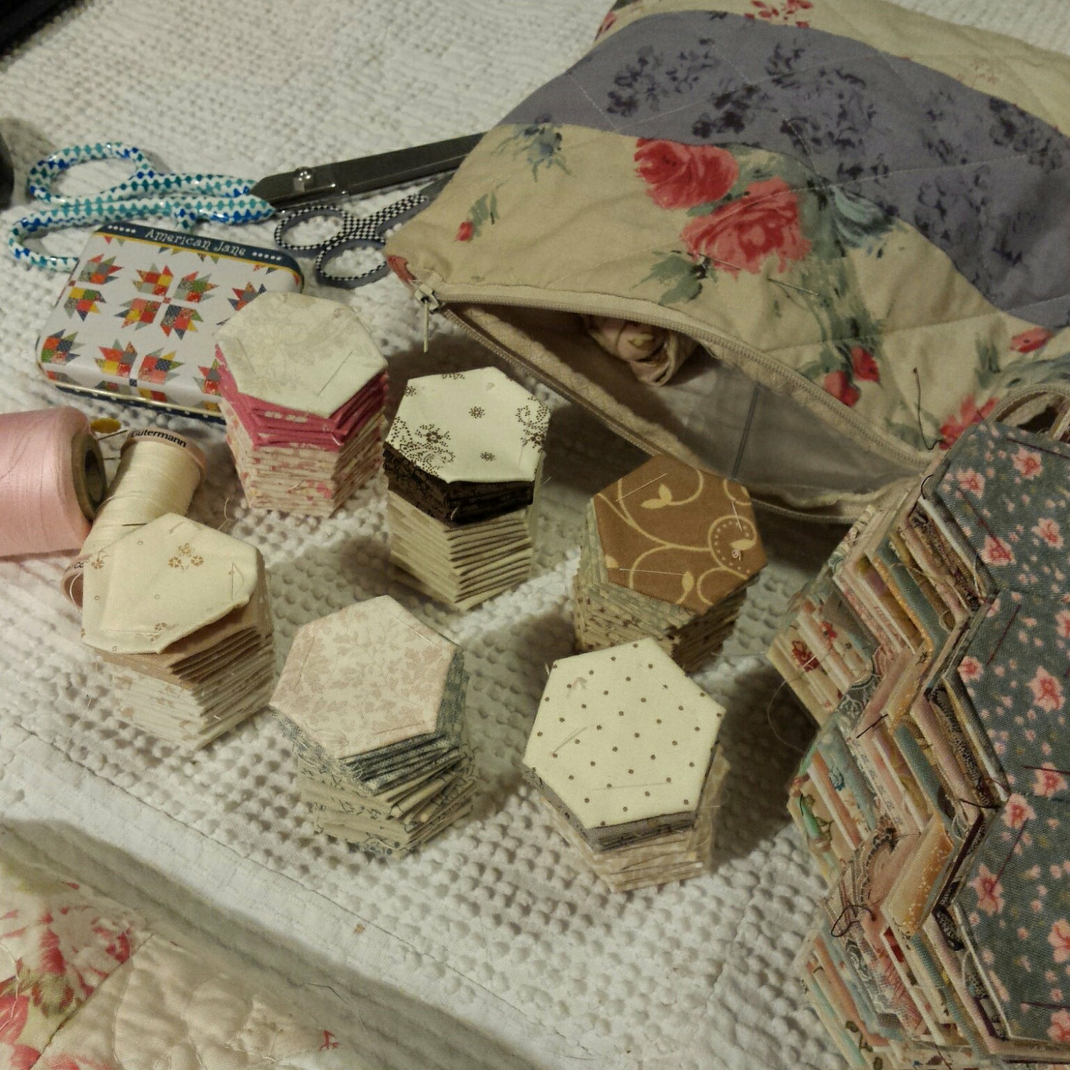 well…after I had finished my flowers I had extra basted hexies left…and as much as I like have bits, bobs, and things…I’ve decided I really and truly need to start being a little more organized (just a smidge…)