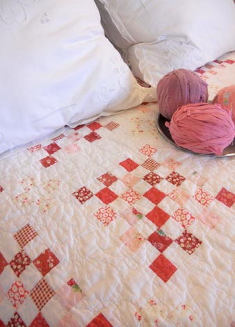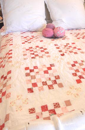 English Garden is 88 x 106 inches and features 10 shades of pink ranging from cotton candy to rouge. Then we used a bleached muslin for the sashing, a small floral for the cornerstone 9-patch, a small rose print for the border, a cream and dark rosey-pink for the check binding.
